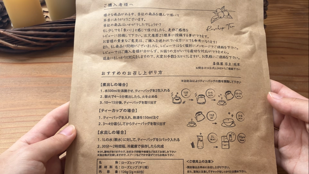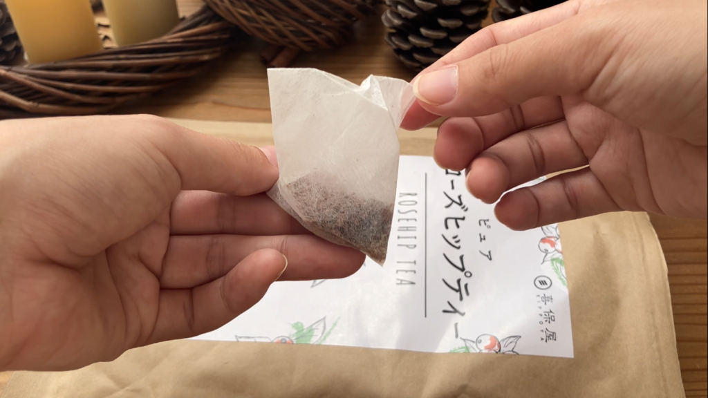 ティーパックに入った形でしたが、ローズヒップは実の方にビタミンが沢山…ということでパックを開けて、ファインカットされたローズヒップティーの実とともに、お砂糖たっぷりでほっこりしながら飲んでおります。
